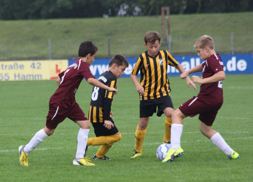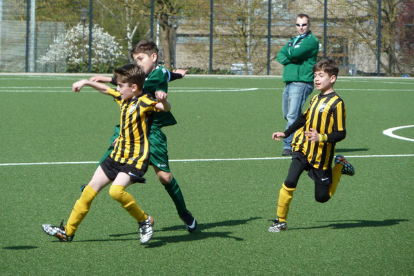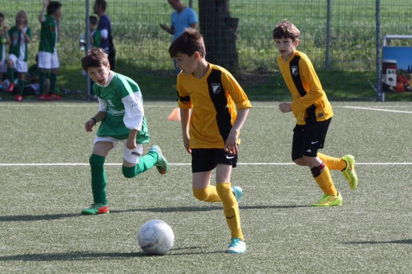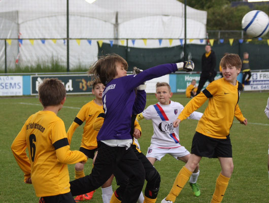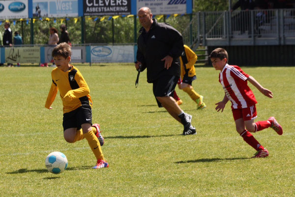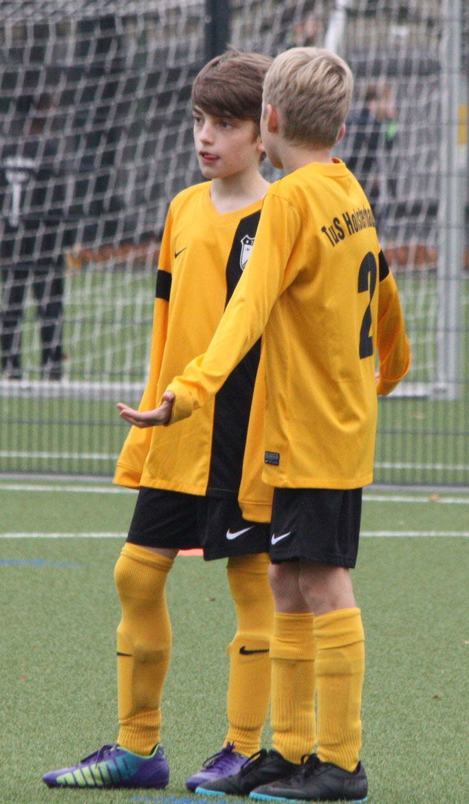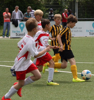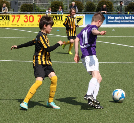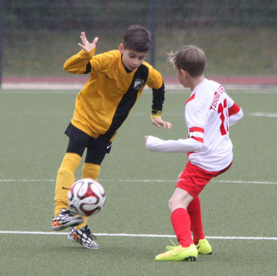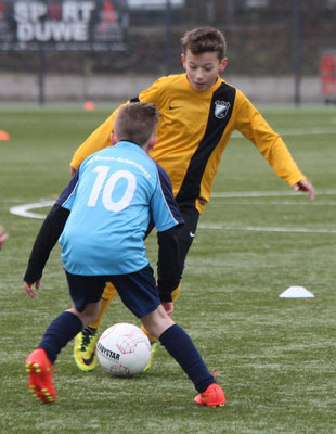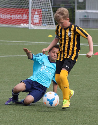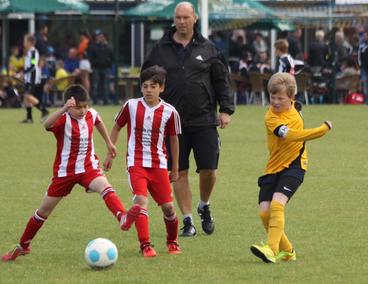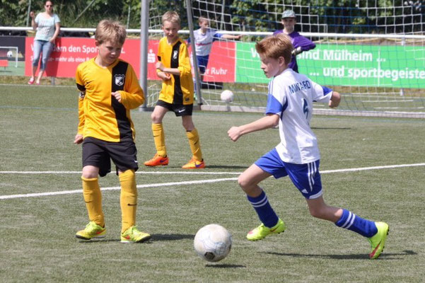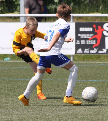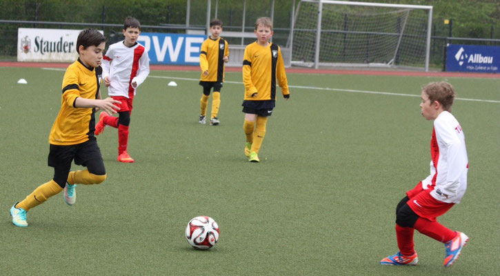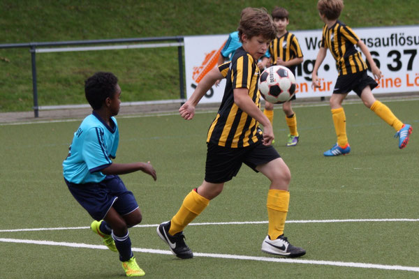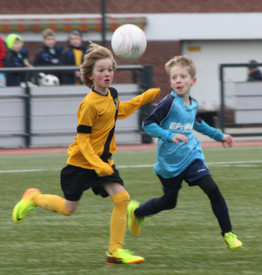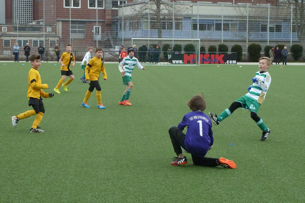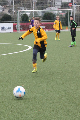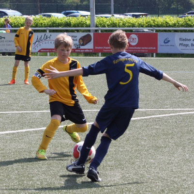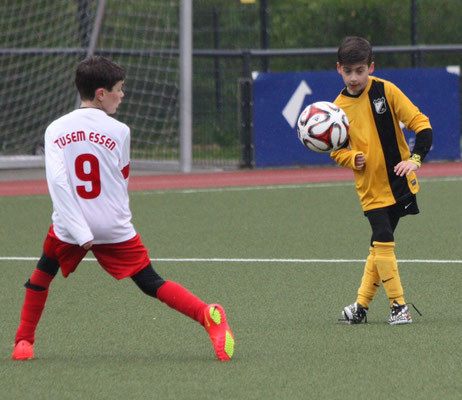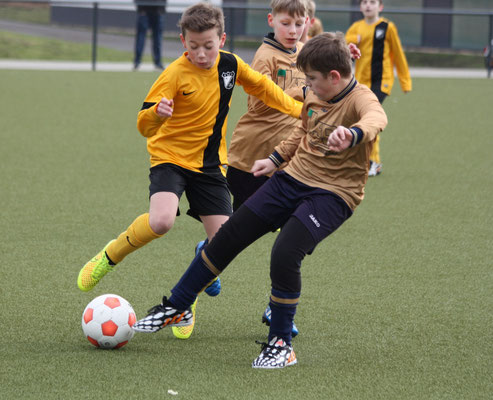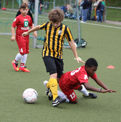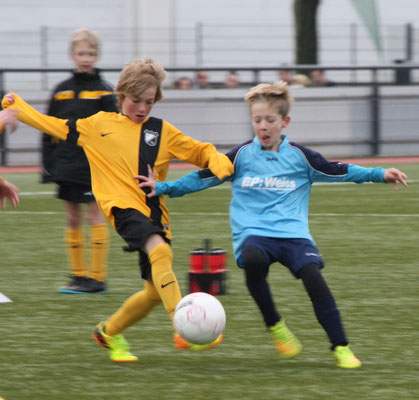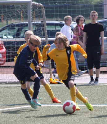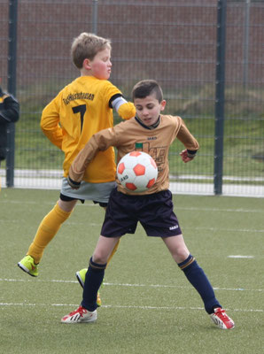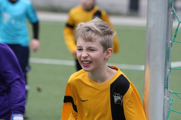 Im ersten Spiel gab es einen verdienten 1:0-Sieg gegen Eintracht Gelsenkirchen. Paul hatte den entscheidenden Treffer erzielt. Im zweiten Match ging es gegen die SG Kupferdreh-Byfang. Nach einem 0:1-Rückstand drehten Rico und Tom mit ihren Toren die Partie. Doch nach einer Ecke in der Schlussminute gelang der SG noch der 2:2-Ausgleich. Dies bedeutete, dass unsere Jungs aufgrund des unnötigen Punktverlustes das letzte Gruppenspiel gegen Rot Weiss Mülheim gewinnen mussten, um ins Finale einzuziehen. Und das TuS-Team hatte tatsächlich die große Chance, das Endspiel zu erreichen, als es Strafstoß für unser aufopferungsvoll kämpfendes Team gab. Doch Georgios, ansonsten ein überaus sicherer Schütze vom Punkt, vergab diese Möglichkeit, so dass die Partie 0:0 endete.