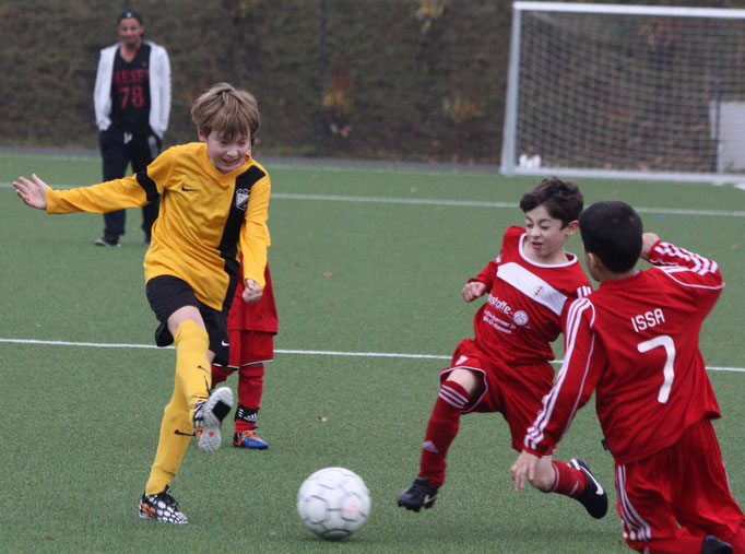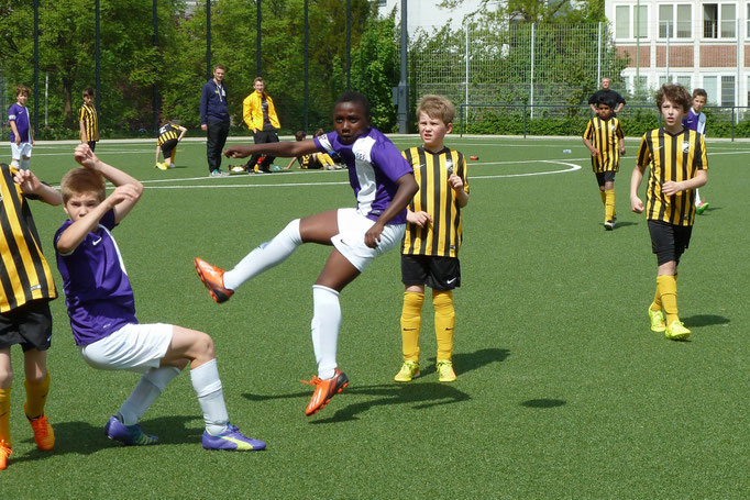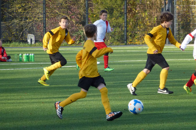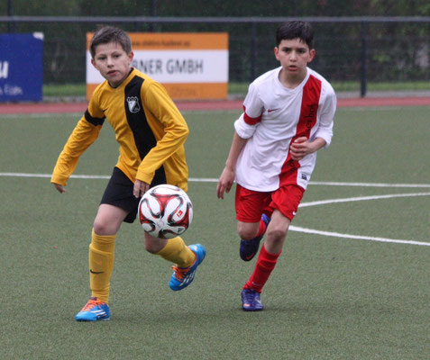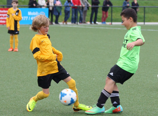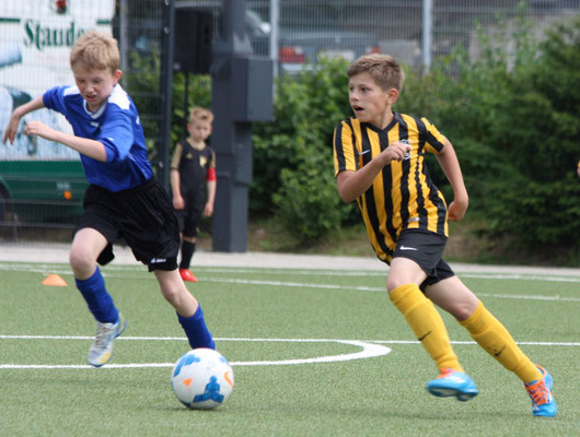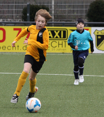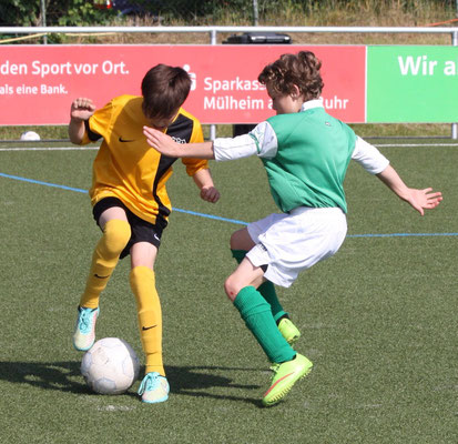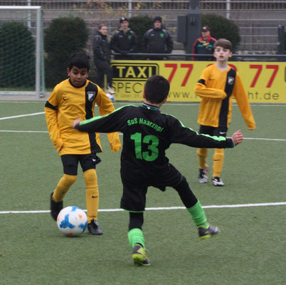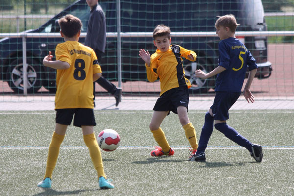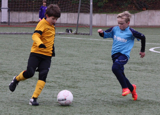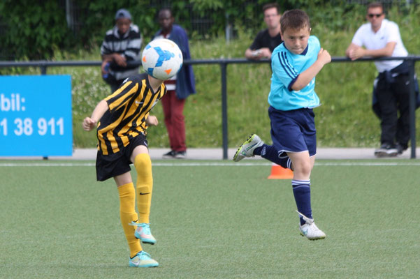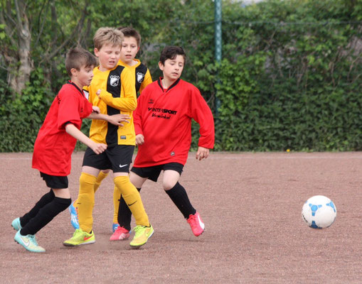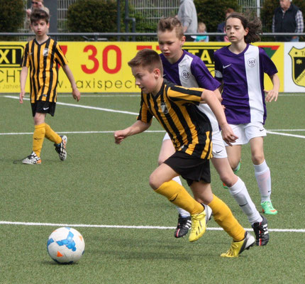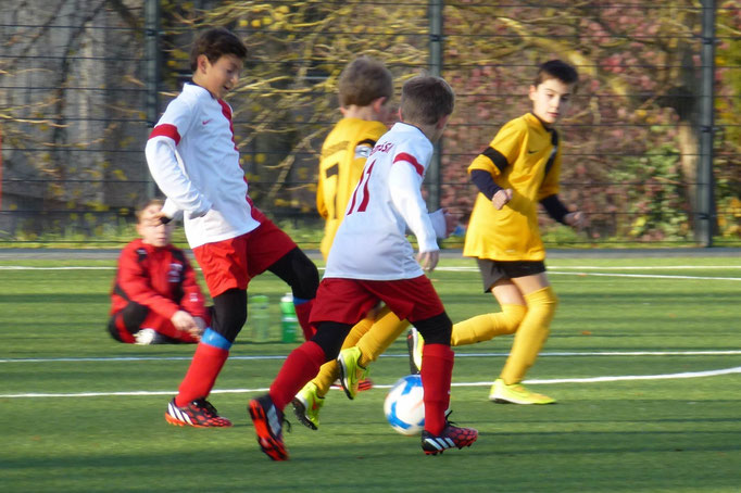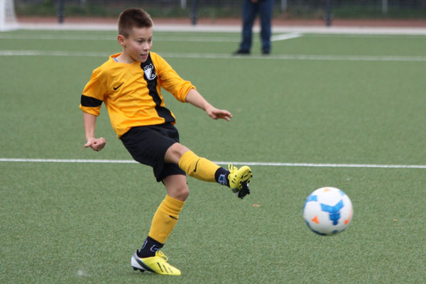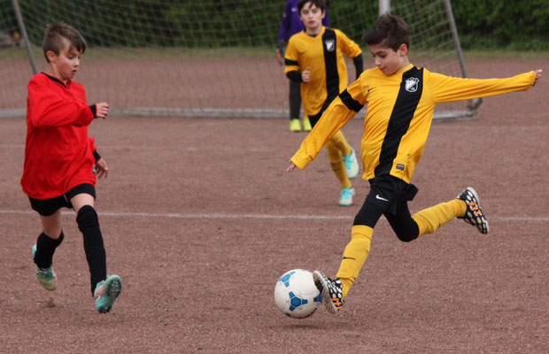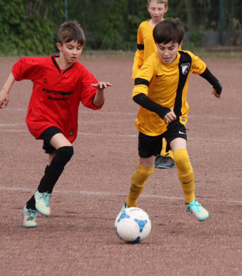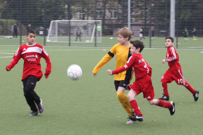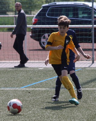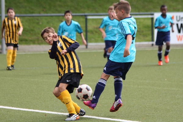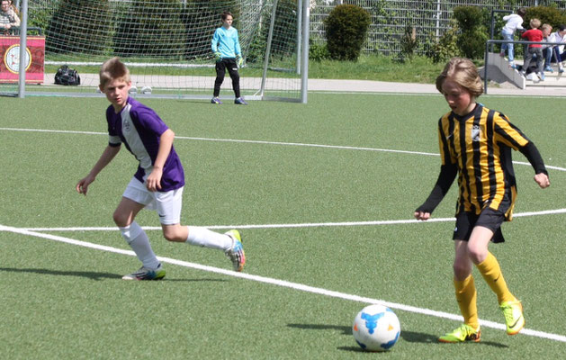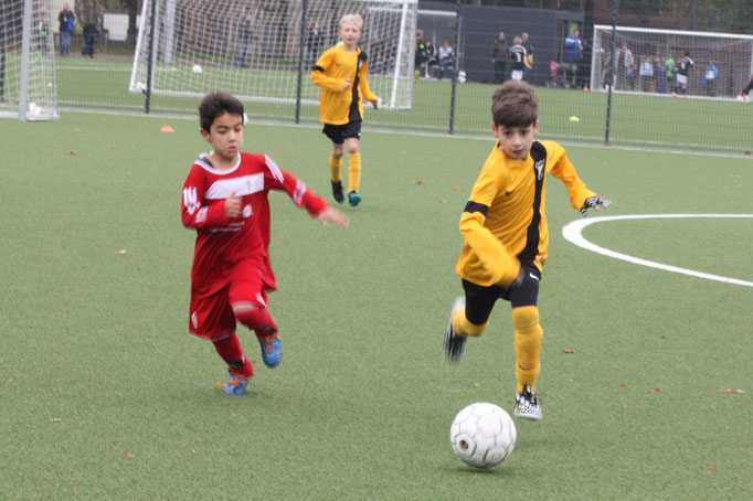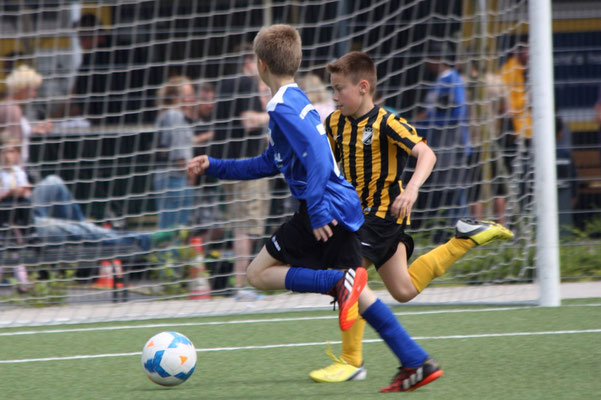 Im ersten Spiel gab es einen verdienten 1:0-Sieg gegen Eintracht Gelsenkirchen. Paul hatte den entscheidenden Treffer erzielt. Im zweiten Match ging es gegen die SG Kupferdreh-Byfang. Nach einem 0:1-Rückstand drehten Rico und Tom mit ihren Toren die Partie. Doch nach einer Ecke in der Schlussminute gelang der SG noch der 2:2-Ausgleich. Dies bedeutete, dass unsere Jungs aufgrund des unnötigen Punktverlustes das letzte Gruppenspiel gegen Rot Weiss Mülheim gewinnen mussten, um ins Finale einzuziehen. Und das TuS-Team hatte tatsächlich die große Chance, das Endspiel zu erreichen, als es Strafstoß für unser aufopferungsvoll kämpfendes Team gab. Doch Georgios, ansonsten ein überaus sicherer Schütze vom Punkt, vergab diese Möglichkeit, so dass die Partie 0:0 endete.