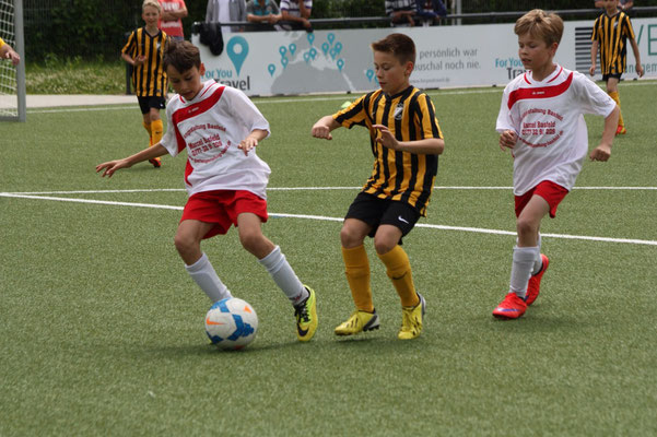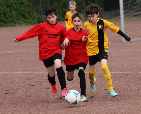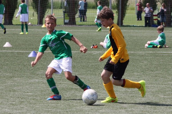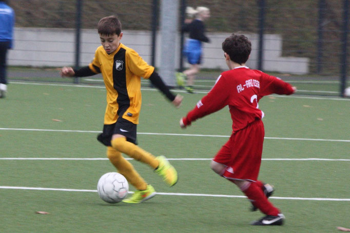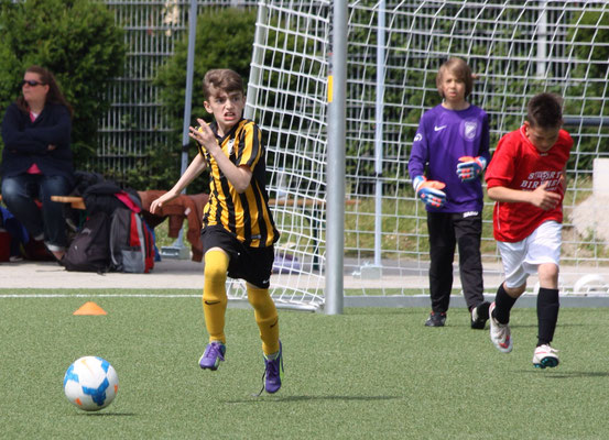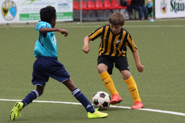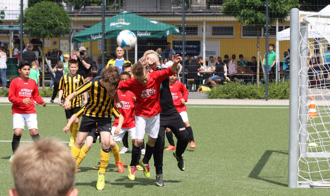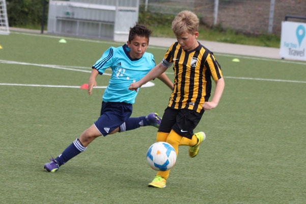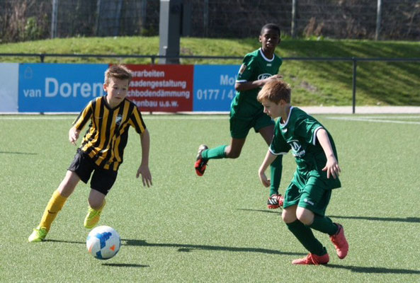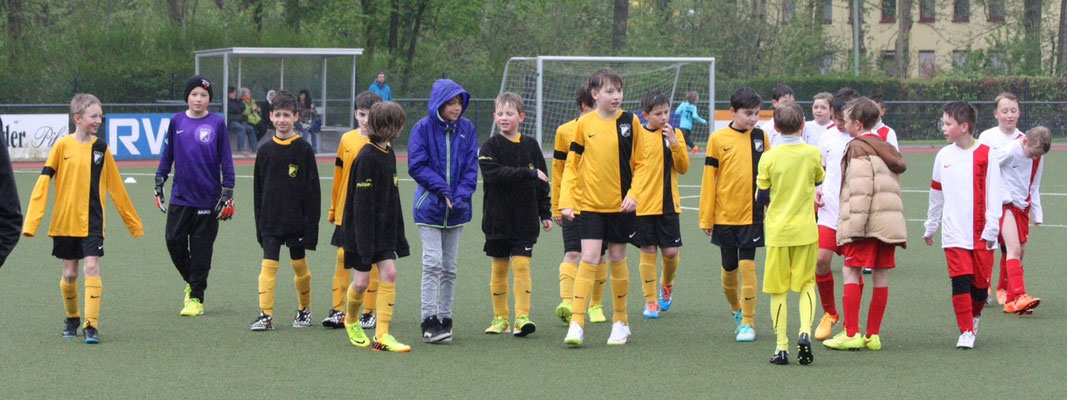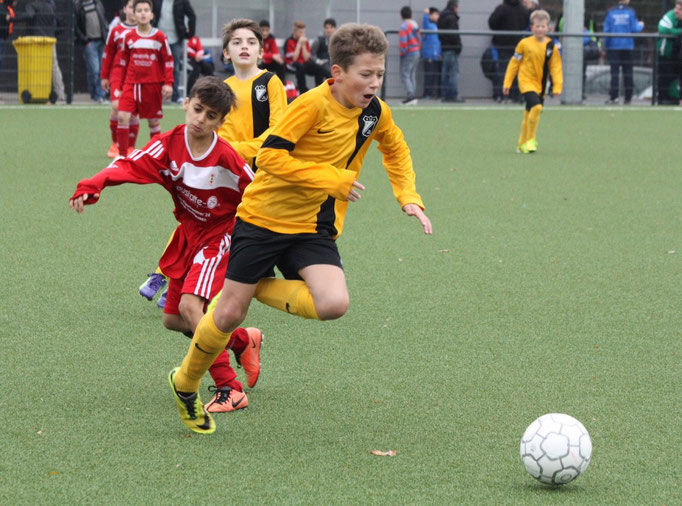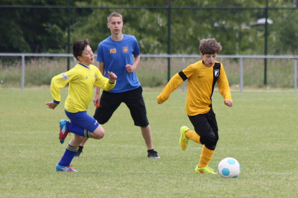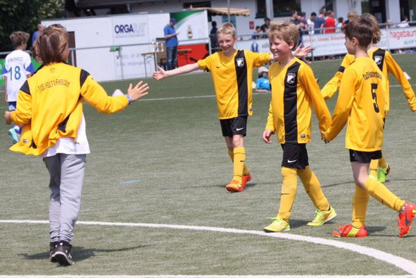 Dabei hatte das Turnier überaus unglücklich für das Team angefangen. Denn im ersten Spiel waren unsere Jungs gegen den Rüttenscheider SC zwar mit 1:0 durch in Paul in Führung gegangen, doch die Rüttenscheider waren anschließend noch dreimal erfolgreich, so dass das Auftaktmatch mit 1:3 verloren ging. Doch unsere Jungs ließen sich dadurch nicht beirren und siegten anschließend mit 6:0 gegen Adler Union Frintrop II (Tore Bleon 2, Rico, Mark, Paul und Luis), gegen Ratingen 04/19 mit 2:0 (beide Tore Georgios, zuerst per Foulelfmeter, dann per Kopfball) und gegen den SV Raadt mit 5:2 (Tore Paul, 2, Rico und Mark). Da die Rüttenscheider gegen Raadt 1:1 gespielt hatten, reichte unseren Jungs im letzten Gruppenspiel gegen die ungeschlagene Mannschaft von Blau-Weiß Mintard ein Remis, um ins Halbfinale einzuziehen. Nach einem 0:1-Rückstand war es Rico, der in der letzten Spielminute mit einem Schuss in den Winkel das 1:1 erzielte und das Weiterkommen sicherte.