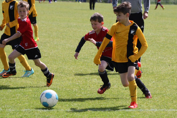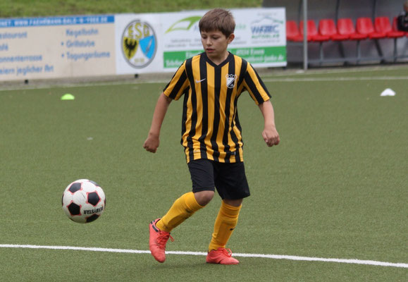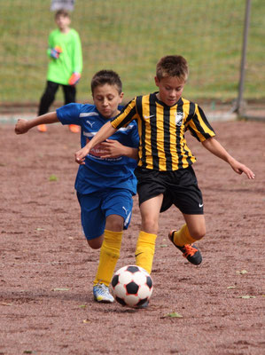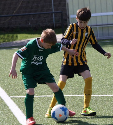 Und tatsächlich, im zweiten Durchgang agierte das Team in den schwarz-gelb-gestreiften Trikots weitaus engagierter, ließ kaum noch Chancen der Gäste zu und drängte mit aller Macht auf den zweiten Treffer. Und der fiel auch, als sich Mark auf der rechten Seite durchgesetzt und in die Mitte gepasst hatte, wo Bleon goldrichtig und stand und zum 2:3 traf. Wenig später hatte Tom den Ausgleich auf dem Fuß, doch mit einer Glanzparade lenkte der Adler-Keeper den Ball über die Latte. Umso überraschender war der vierte Treffer für die Gäste. Dennoch gab der TuS nicht auf, und Lars erzielte das 3:4. Zu mehr reichte es aber nicht mehr, so dass unsere Jungs einmal mehr mit hängenden Köpfen vom Platz gehen mussten.