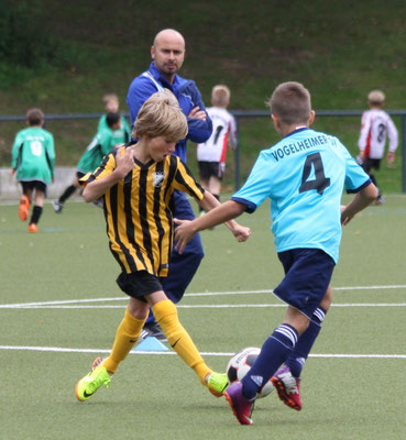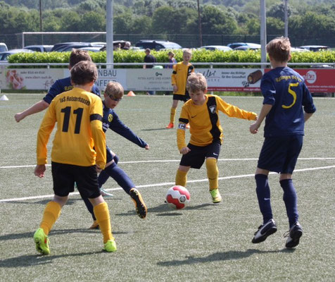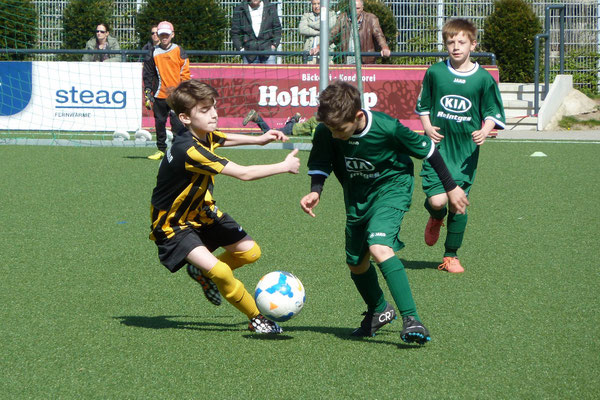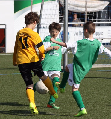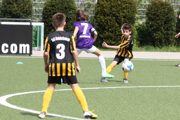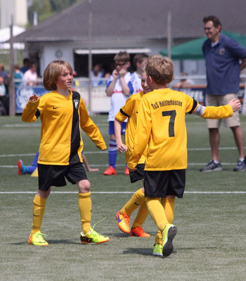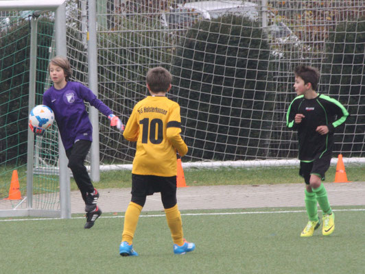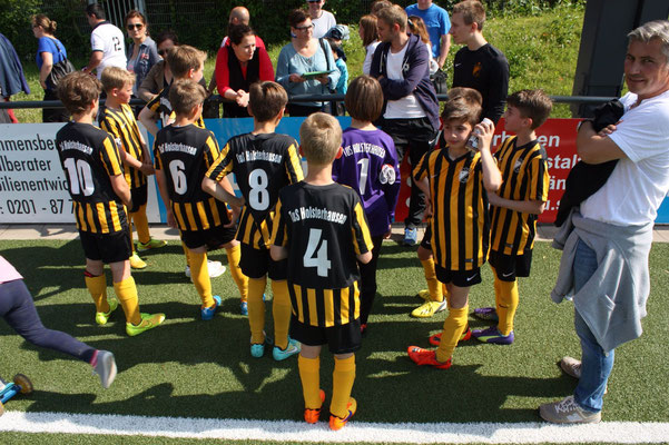 Im Spiel um Platz drei hieß der Gegner wieder einmal Vogelheimer SV. Hatte es gegen diese Mannschaft in der Vorwoche beim Turnier von TuSEM noch eine 1:4-Niederlage gegeben, traten unsere Jungs den Gästen dieses Mal auf Augenhöhe gegenüber. Tom brachte Holsterhausen mit 1:0 in Front. Doch Vogelheim gelang noch der 1:1-Ausgleich, so dass es ins Neunmeterschießen ging. Hier hatte der VSV dann das bessere Ende für sich und gewann mit 4:2.