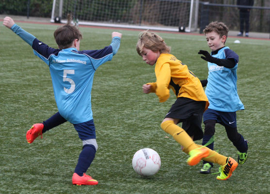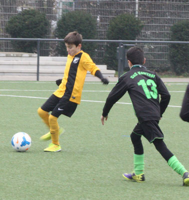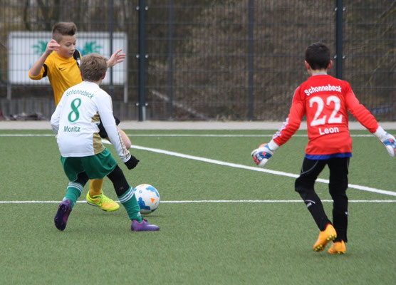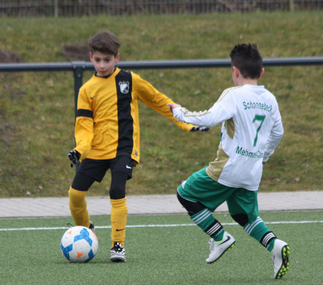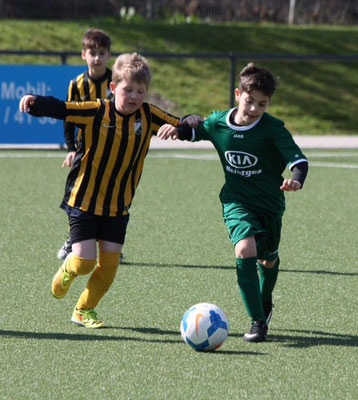 Vor der Partie hatte das Team, das erst in der Winterpause in diese ungemein gut besetzte Liga aufgestiegen war, einmal mehr zwei personelle Rückschläge zu verkraften. Erion (krank) und Rico verletzt) standen leider nicht zur Verfügung. Dennoch hielten unsere Jungs im ersten Durchgang gut mit gegen eine spielerisch starke und ausgeglichen besetzte Gästemannschaft. Nach dem 0:1 hatte Lars den Ausgleich auf dem Fuß, scheiterte mit seinem Drehschuss aber am Torwart aus Schonnebeck. Und auch als die überlegenen Gäste auf 0:2 erhöhten, zeigten unsere Jungs Moral. Vor der Pause hätte Camillo schon den Anschlusstreffer markieren können, traf freistehend den Ball aber nicht richtig. Besser machte es nach dem Wechsel Lars, der auf 1:2 verkürzte und kurzzeitig neue Hoffnung im TuS-Lager aufkommen ließ. Aber im direkten Gegenzug stellte die Spvg. mit dem 1:3 den alten Abstand wieder her und sorgte dafür, dass bei unseren E-Junioren die Lust und der Glaube an eine Wende verloren gingen. So hatten die agilen Gäste letztlich leichtes Spiel, noch vier weiter Tore nachzulegen und die Partie mit 7:1 zu gewinnen.