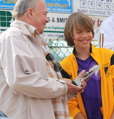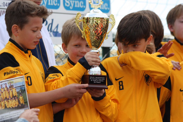 Dennoch war bei dieser hervorragend und überaus liebevoll organisierten Veranstaltung die Lust auf guten Fußball am nächsten Morgen riesengroß. Und so starteten die Jungs mit einem furiosen 4:3-Sieg in den Tag. Die Treffer bei der rasanten Partie gegen Sterrenwijk 4:3 erzielten der an diesem Tag überragende Rico (2), Lars und Mark. Anschließend ließen unsere Jungs zwei 1:0-Siege folgen. Gegen Bergisch Gladbach markierte Lars den entscheidenden Treffer, gegen Germania Dürwiß Paul. Anschließend ließen es unsere Jungs ein wenig lockerer angehen, zumal auch kräftig durchgetauscht und alle 13 Akteure, die mitgereist waren, ihre Einsatzzeiten bekamen. Gegen DJK Südwest Köln gab es nach einem Treffer von Lars ein 1:1, gegen Gastgeber Kerkrade West mussten sich unsere Jungs trotz zahlreicher Chancen mit einem 0:0 zufrieden geben. Damit war das Viertelfinale erreicht, wo mit dem SV St. Tönis kurzen Prozess gemacht wurde. Rico (3) und Paul (2) sorgten mit ihren Toren für einen souveränen 5:0-Erfolg. Im Halbfinale gegen die SpVgg. Porz lief dann aber urplötzlich gar nichts mehr zusammen. In der Abwehr wurden unerklärliche Fehler gemacht und vorne die besten Chancen vergeben. So hieß es nach 15 Minuten 1:5 (Tor Lars), und das ersehnte Endspiel war verpasst. Dafür ließen unsere Jungs dann im Spiel um Platz drei die Mannschaft aus Heerlen für den verpassten Einzug ins Endspiel büßen. Mit 4:0 setzten sich der TuS nach Toren von Rico (2), Paul und Lars gegen die Niederländer durch und belegten damit Rang drei. Im Finale gewann Bergisch Gladbach deutlich gegen Porz, so dass unsere Jungs die einzige Mannschaft war, die den Turniersieger an diesem Tag bezwungen hatte.