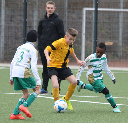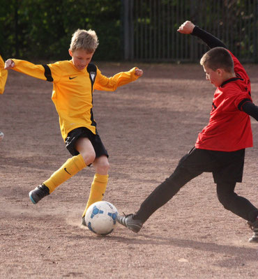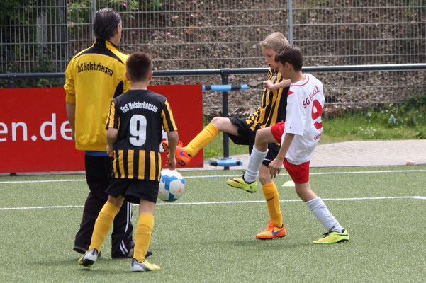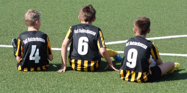 Von Beginn an bestimmten die Kicker aus Holsterhausen das Geschehen, waren sich offensichtlich der Wichtigkeit der Partie bewusst. Denn wenn die Gastgeber aus Schönebeck das Match gewonnen hätten, wären sie noch am TuS vorbeigezogen. Doch die Holsterhausener waren konsequent in den Zweikämpfen, ließen den Ball toll laufen und sorgten selbst bei den Eltern der SG-Spieler aufgrund ihrer Kombinationssicherheit für Aufsehen. So waren die drei Treffer von Lars nach einem feinen Pass von Tom zum 1:0, von Tom, dessen Flanke ein Schönebecker zum 2:0 ins eigene Tor abfälschte, und von Rico zum 3:0 nur eine logische Folge der Überlegenheit. Erst kurz vor dem Wechsel gelang der SG der 3:1-Anschlusstreffer.