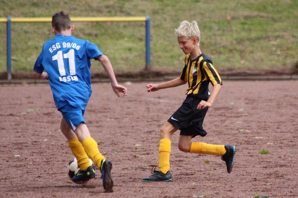 Am Ende gab es zwar eine böse Klatsche, dennoch herrschte bei den E1-Junioren bei dem ersten Turnier der neuen Saison bei ESG 99/06 keine schlechte Stimmung. Denn eine Woche vor dem ersten Meisterschaftsspiel präsentierten sich die Jungs bei diesem prächtig besetzten Turnier durchaus gut. – Alle Spieler des Kaders - außer Tom, Haris und Tom, die verhindert bzw. verletzt waren – waren mit dabei und bekamen während der drei Turnierspiele ihre Einsatzzeiten. Es wurde also immer wieder bunter durchgemischt. Umso beachtlicher waren die Leistungen in den ersten beiden Spielen. Gegen den Gastgeber gab es ein 0:0, wobei ein Sieg durchaus möglich war. Denn Lars scheiterte kurz vor dem Abpfiff mit seiner Direktabnahme am Pfosten. Anschließend ging es gegen Angstgegner Vogelheimer SV, gegen den unsere Jungs bislang immer deutlich unterlegen waren. Doch nachdem Paul den TuS mit einem sehenswerten Freistoß in den Winkel mit 1:0 in Führung gebracht hatte, kämpften die TuS-Jungs in ihren neuen Trikots aufopferungsvoll, hatten den Sieg schon dicht vor Augen, kassierten dann aber noch in der Schlussminute das 1:1. Ohne Chance waren die Jungs dann gegen den Jungjahrgang von RW Essen. Glatt mit 0:7 verlor der TuS. Wichtig ist nun, diese klare Niederlage schnell abzuhaken und die Zuversicht für die Meisterschaft aus den ersten beiden Partien ziehen, wo die TuS-Jungs gute Leistungen gezeigt hatten. - Schade nur, dass der Turnierablauf durch einige kurzfristige Absagen von Mannschaften gehörig durcheinandergeraten war und niemand so recht wusste, wann und gegen wen das nächste Spiel stattfindet. – p.d.