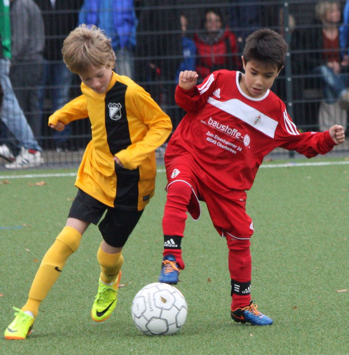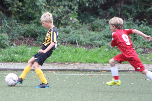 In der Defensive stand das Team ungemein sicher, gewann fast jeden Zweikampf, und im Spiel nach vorne ließen die Jungs aus Holsterhausen den Ball so geschickt laufen, dass die Gäste aus Frohnhausen nur staunend zusehen konnten. Die logische Folge war eine 5:0-Führung nach 20 Minuten. Zuerst verwertete Lars ein Zuspiel von Paul, dann vollendete Lars nach einem Abschlag von Keeper Carlos. Das 3:0 markierte Camillo, der eine maßgenaue Flanke von Paul volley ins Tor beförderte. Die beiden weiteren Treffer gingen erneut auf das Konto von Lars, der zuerst nach einem Pass von Tom auf 4:0 erhöhte und dann die Vorarbeit von Camillo zum 5:0 nutzte. Nachdem Lars dann noch am Pfosten gescheitert war, trafen die Gäste kurz vor dem Seitenwechsel auf 5:1.