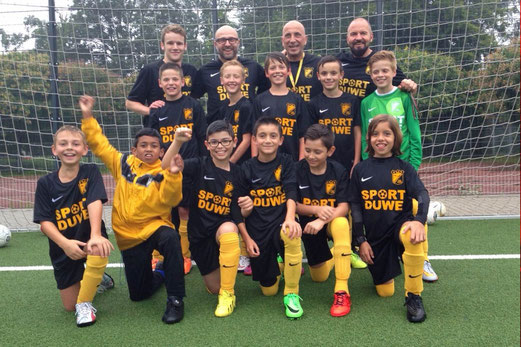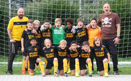 TuS D2-Jugend - Saison 2016/17, noch als E1-Jugend der Saison 2015/16 - obere Reihe v.l.n.r. das Trainerteam Jan, Markus, Ralf und Michele, mittlere Reihe v.l.n.r. Levin, Lenny, Liam, Bleron, Maximilian, untere Reihe v.l.n.r. Robin, Sagheen, Adrian, Emir, Berdihan und Tullio. - Foto: m.d. - Es fehlen Teo und Linus.
